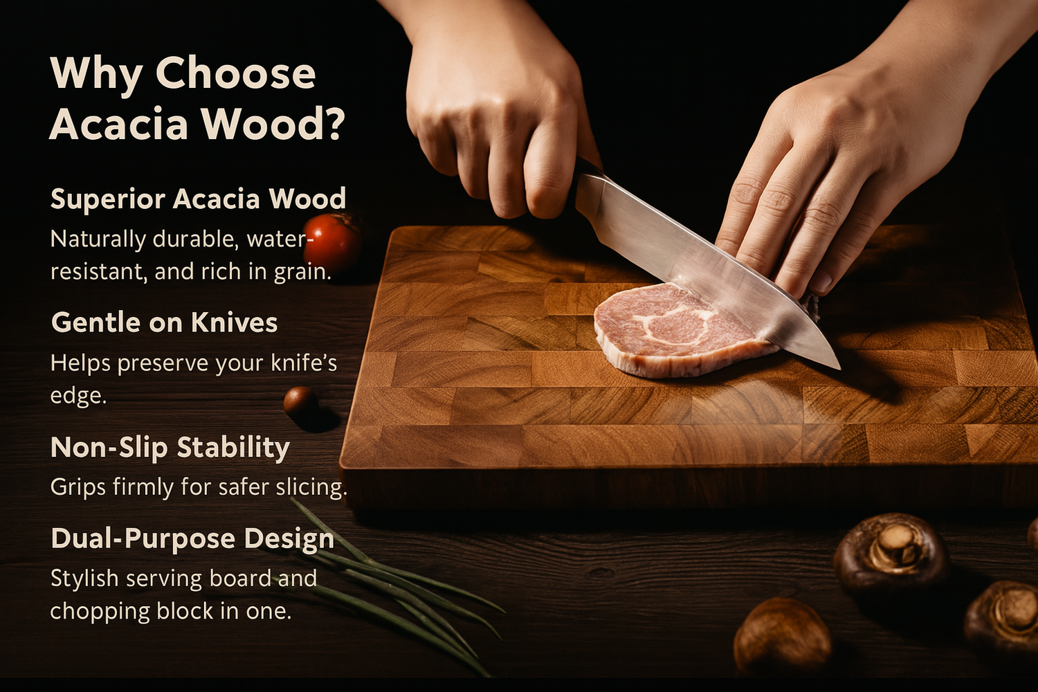 As a professional kitchen brand, we handcraft our boards from premium Acacia wood — more durable, more beautiful, and far superior to standard mass-produced options.